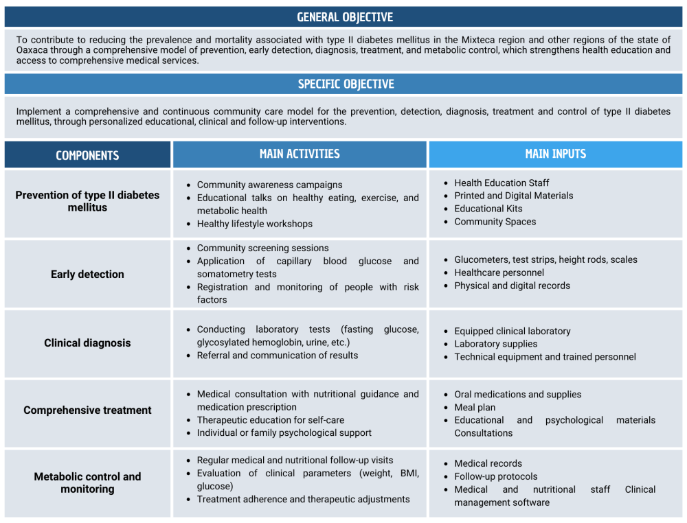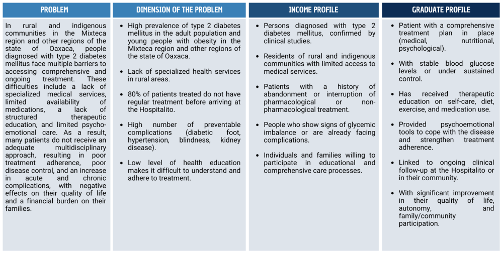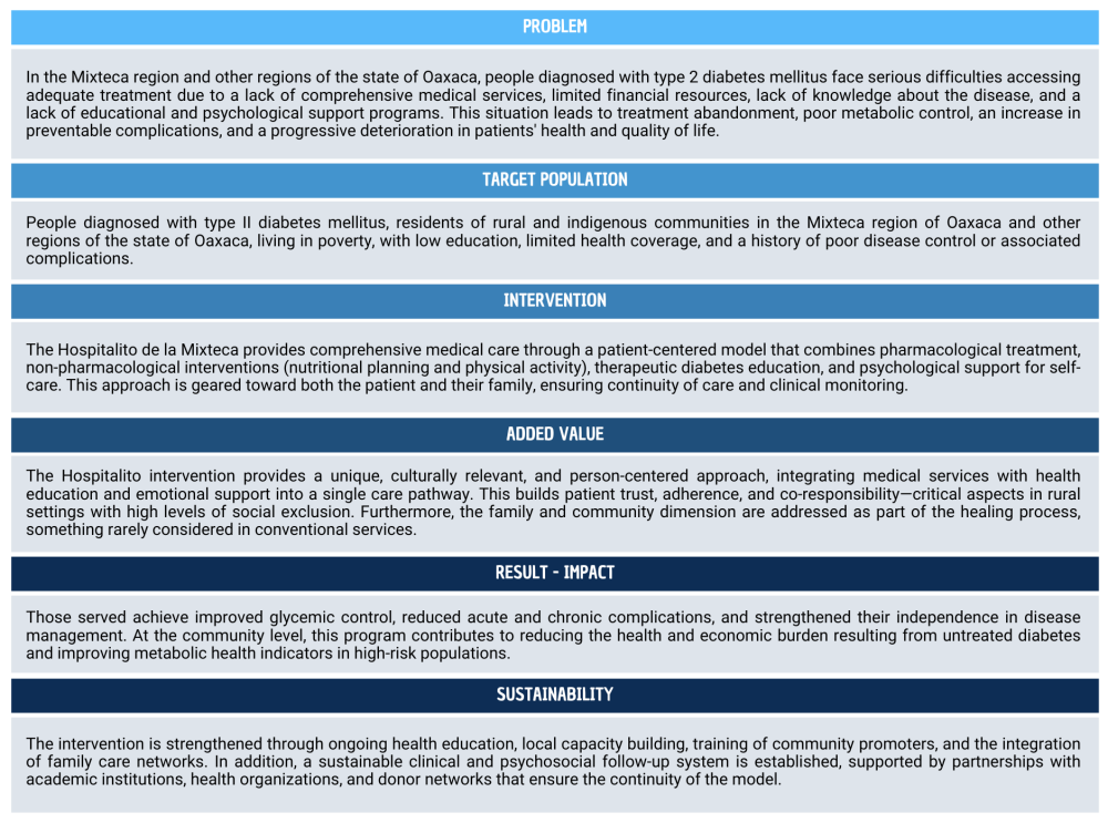 From its inception, Hospitalito de la Mixteca has aimed to intervene through its own comprehensive and systemic care model, structured around five strategic axes: prevention, detection, diagnosis, treatment, and metabolic control of type II diabetes mellitus. This approach has allowed it to serve hundreds of people in vulnerable situations, not only from a medical perspective, but also through psychosocial support, nutritional guidance, and self-care training.